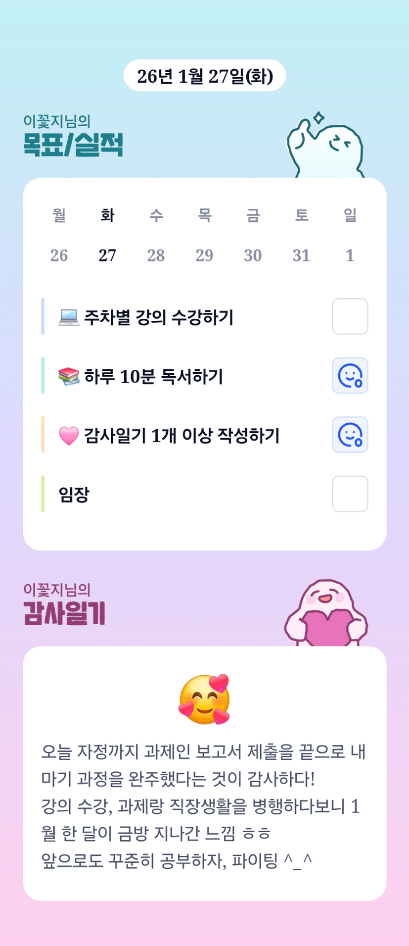 매일 목실감을 기재하지 못해서 아쉽기도 했지만, 꾸준히 목실감을 작성하는 습관을 들이면 목표가 무엇인지, 어떻게 나아갈 것인지 생각 및 실천하게 되기도 하고, 또 감사한 일을 찾음으로써 일상에도 좋은 영향을 미치는 것 같아서 좋았습니다!