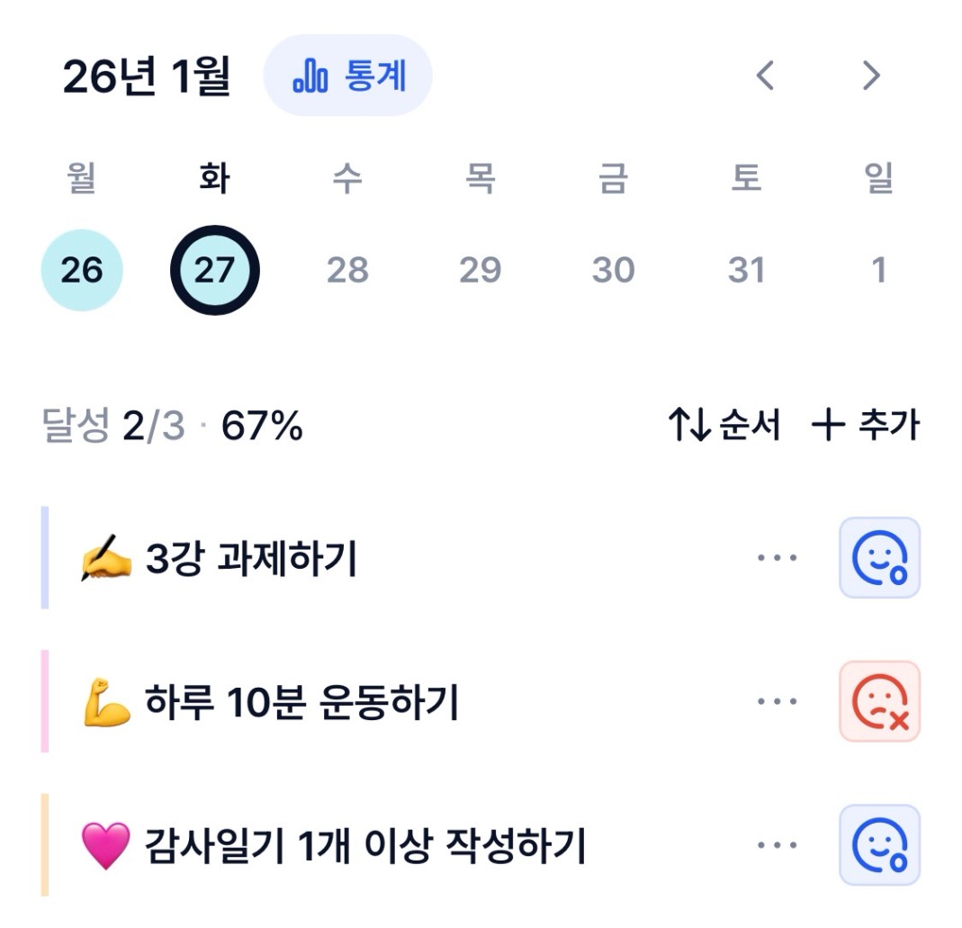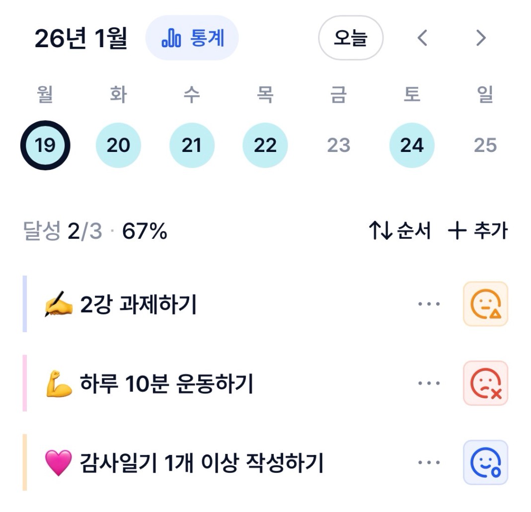 3주간 목실감을 채우기 위해서라도 의식적으로 하루하루 최소 2개의 목표는 달성하려고 노력했던 것 같다.