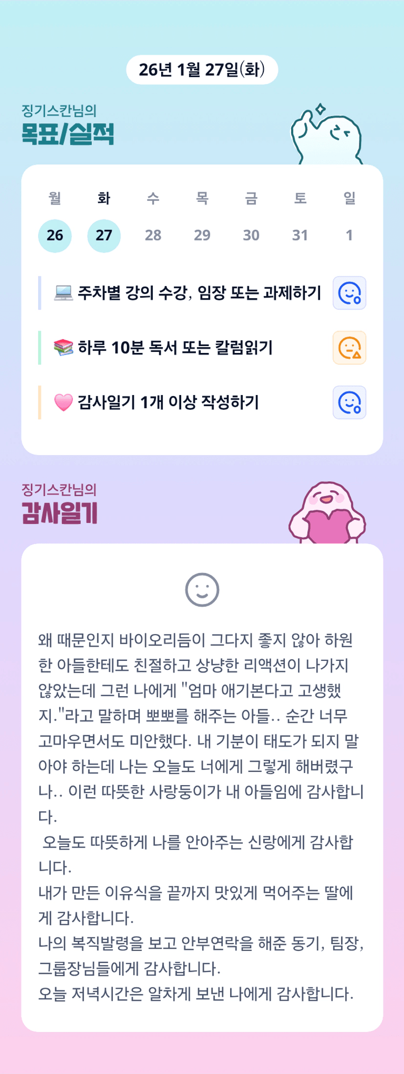 아들 참 기특하네요. 엄마 마음도 다 알아주고.. 오늘 하루도 고생했습니다.
