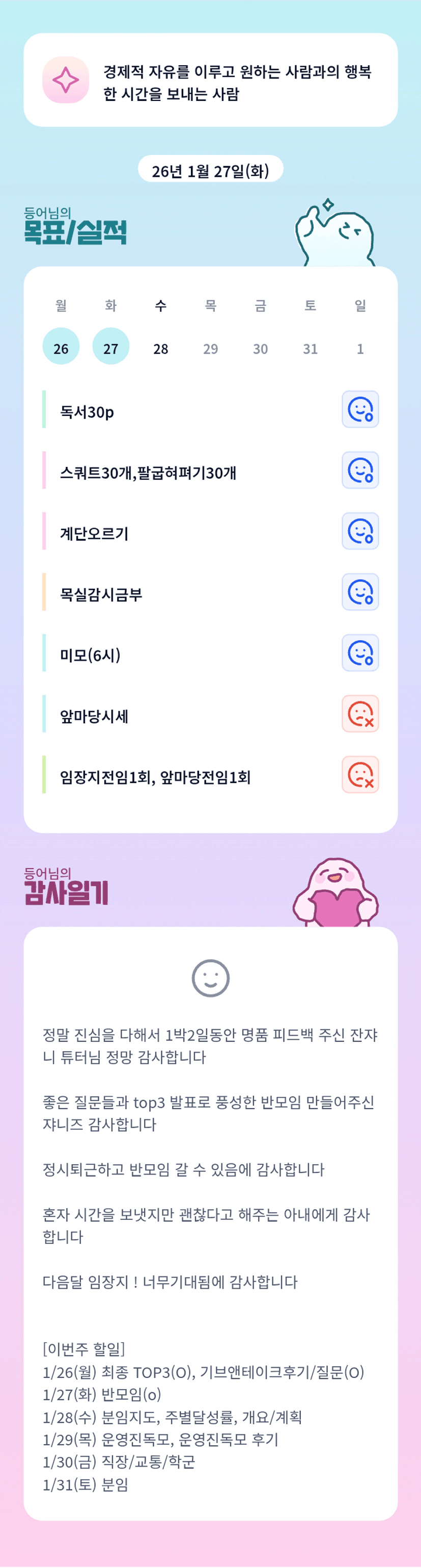반장님 어제 임보 보며 많이 배울 수 있었습니다!! 너무 멋져요 반장님!!!! ㅋㅋ 고생 많으셨습니다 😄