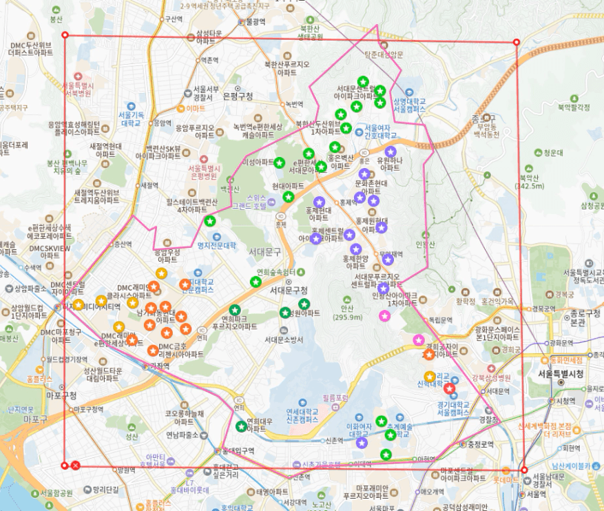 1. 임장지의 단지를 법정동으로 단지를 찍어놓은 핀이 찍혀있는