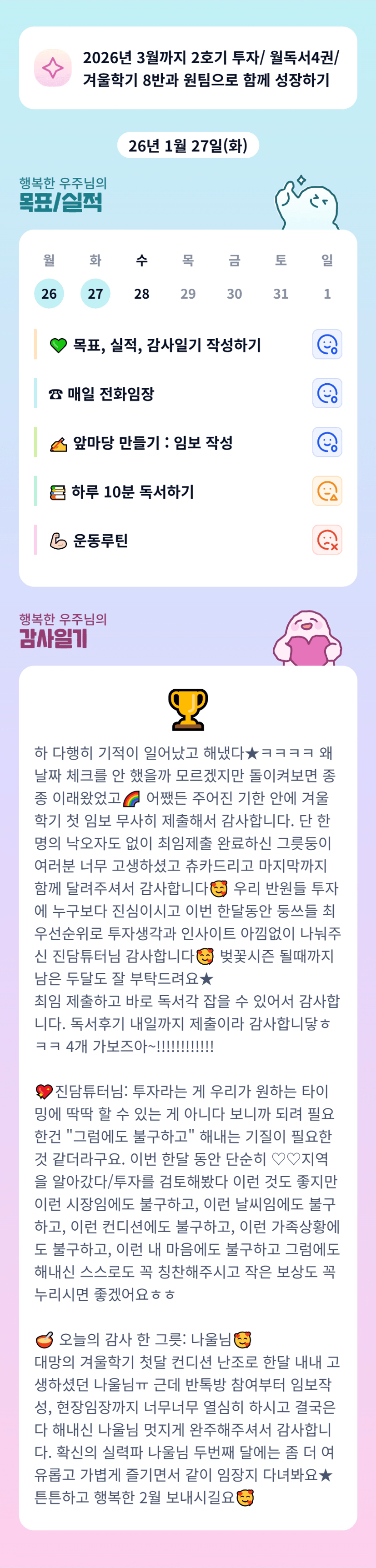 ㅎㅎ 매주 기적을 이뤄내고 있는 행부님 :) 오늘도 기적을 보여주세요~ 항상 감사합니다!!💛