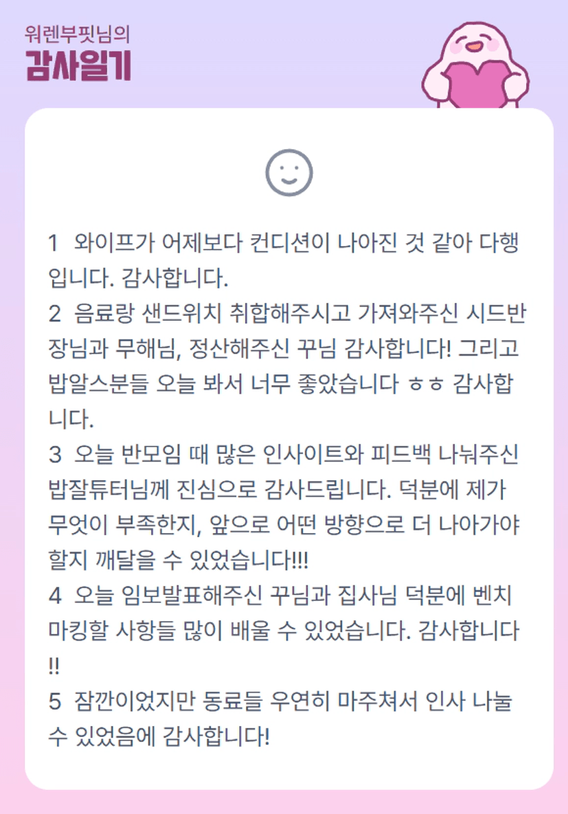 와이프분 좀 나아지셨다니 정말 다행입니다! 어제 핏부님 발표와 좋은 질문 덕에 저도 더 많이 배울 수 있어 감사했습니다. 고생많으셨어요~!! 😆
