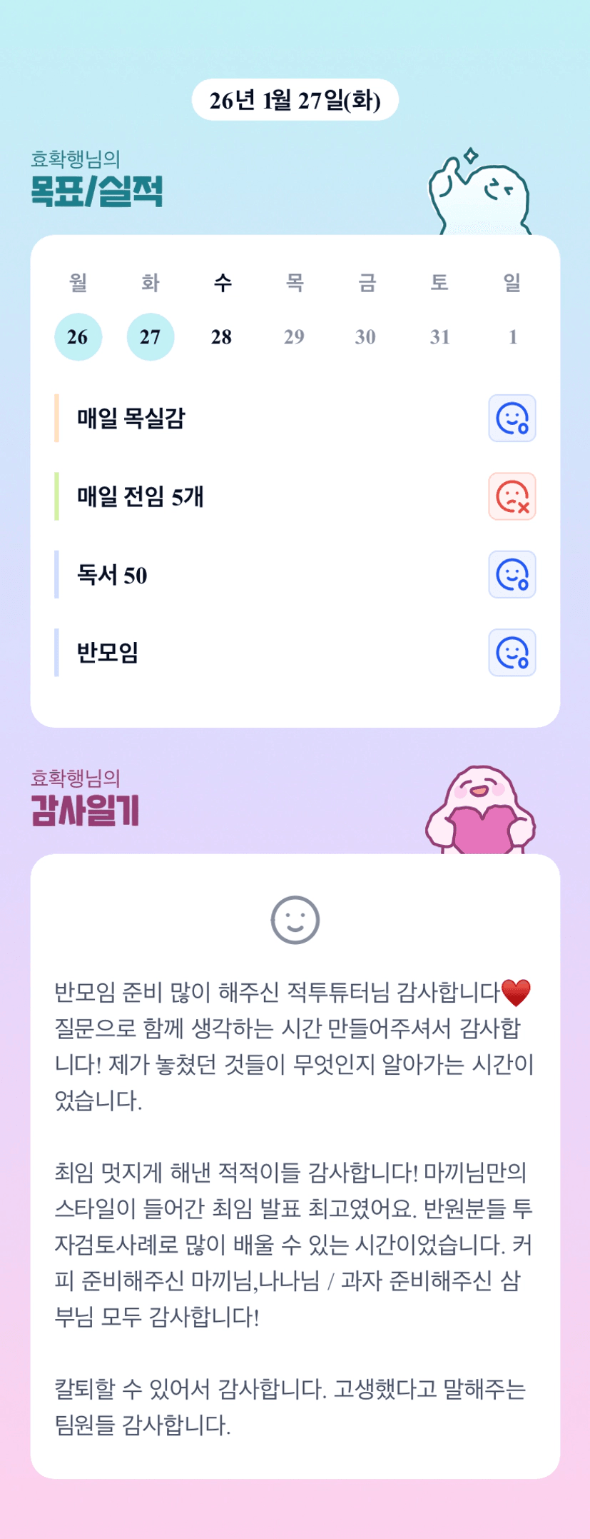 반장님 출장 후 반모임 참여까지 넘넘 고생 많으셨어요 항상 반원들 세심하게 챙겨 주셔서 감사합니당 ^^