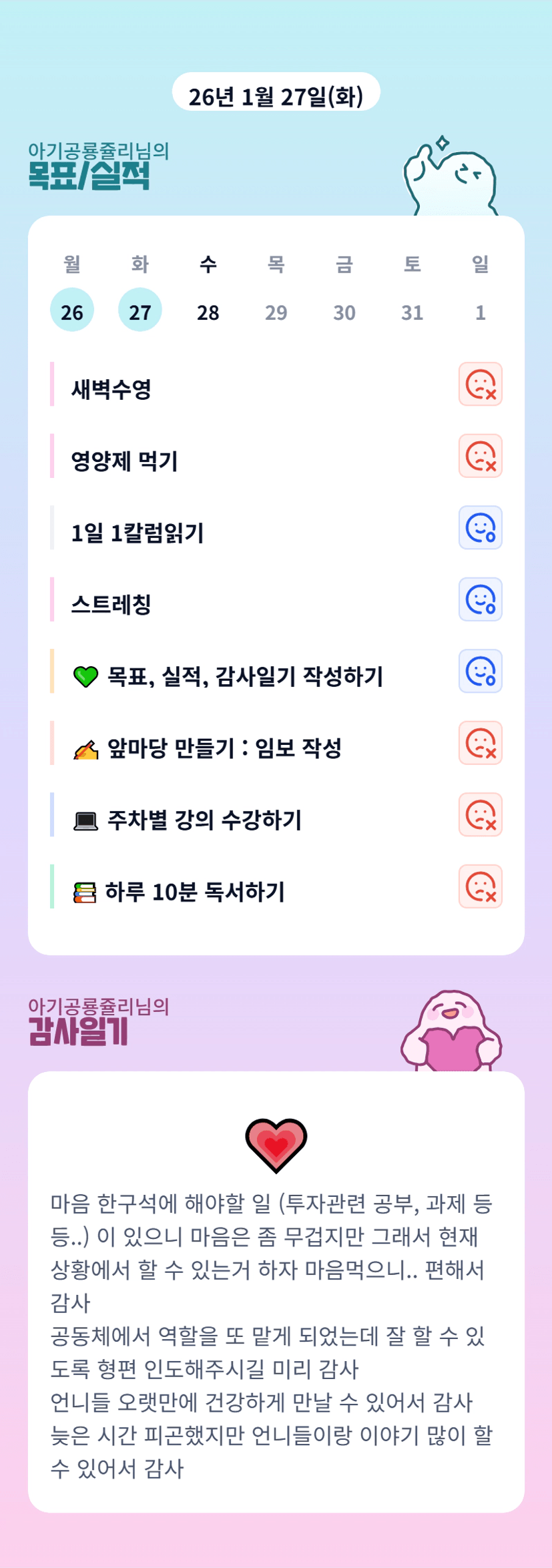 현재 상황에서 할 수 있는 것들을 해내는 멋진 쥴리님 !! ㅎㅎㅎ 빠이팅입니당 ><