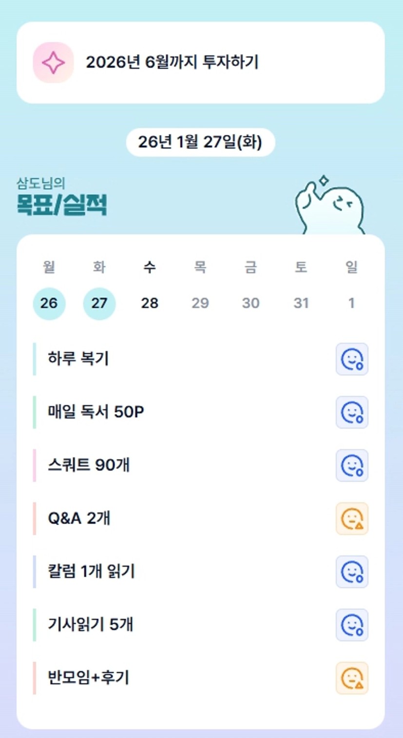 2. 적투 튜터님과 적적이들 1달 간의 일정을 잘 마무리 할 수 있음에 감사합니다. 튜터님의 피드백으로 지역을 더욱 깊이 이해할 수 있었고 투자 우선 순위를 좀 더 명확하게 정리할 수 있음에 감사합니다. TOP3 물건과 재/재 투자에 대한 고민도 알기 쉽게 설명해 주셔서 감사합니다.
