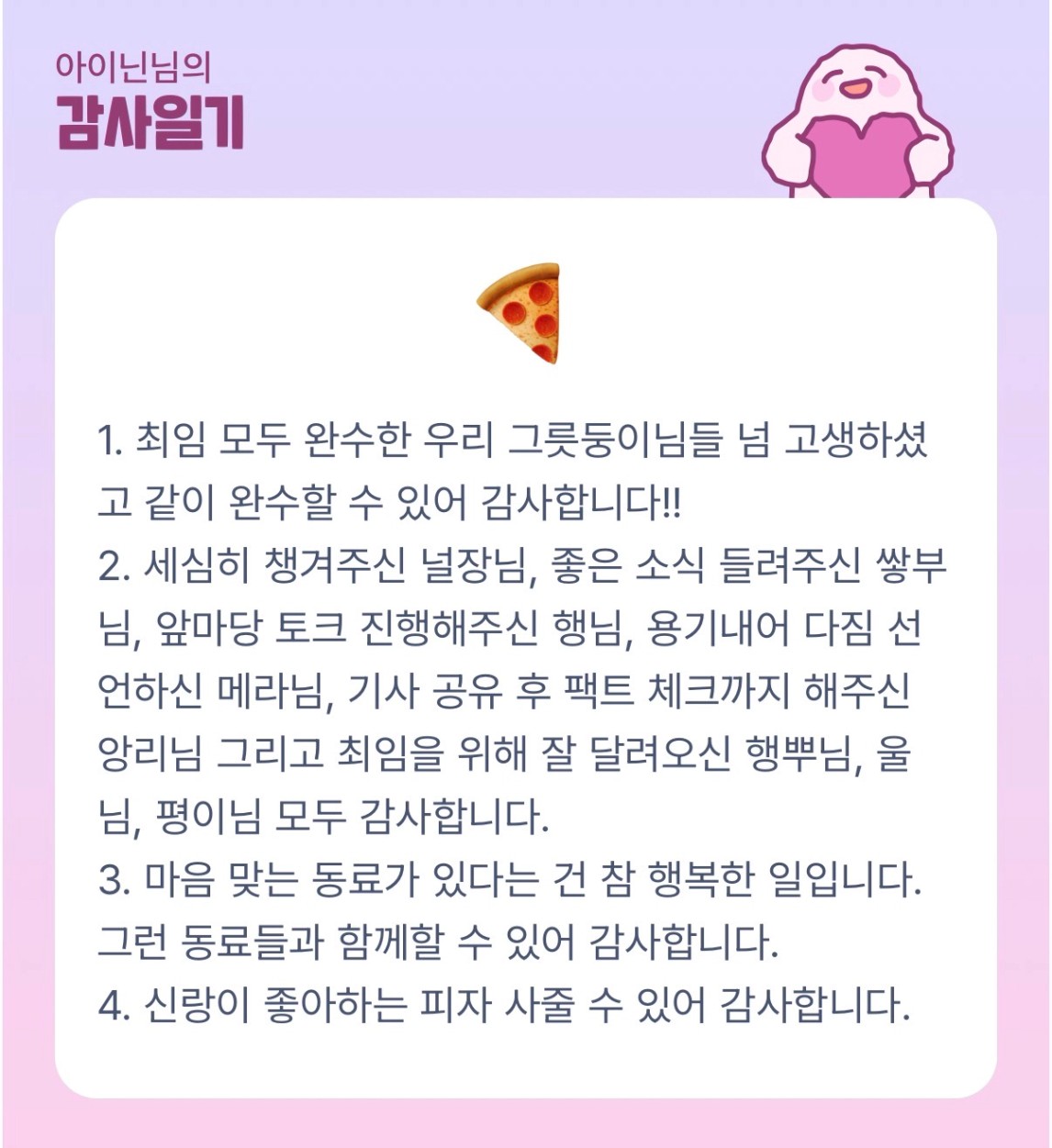 훌륭한 이닌 슨배님과 함께 해서 늘 감사합니다!!! 최임 너무 고생많으셨고 피자 파티!! 멋지십니다!! 😁