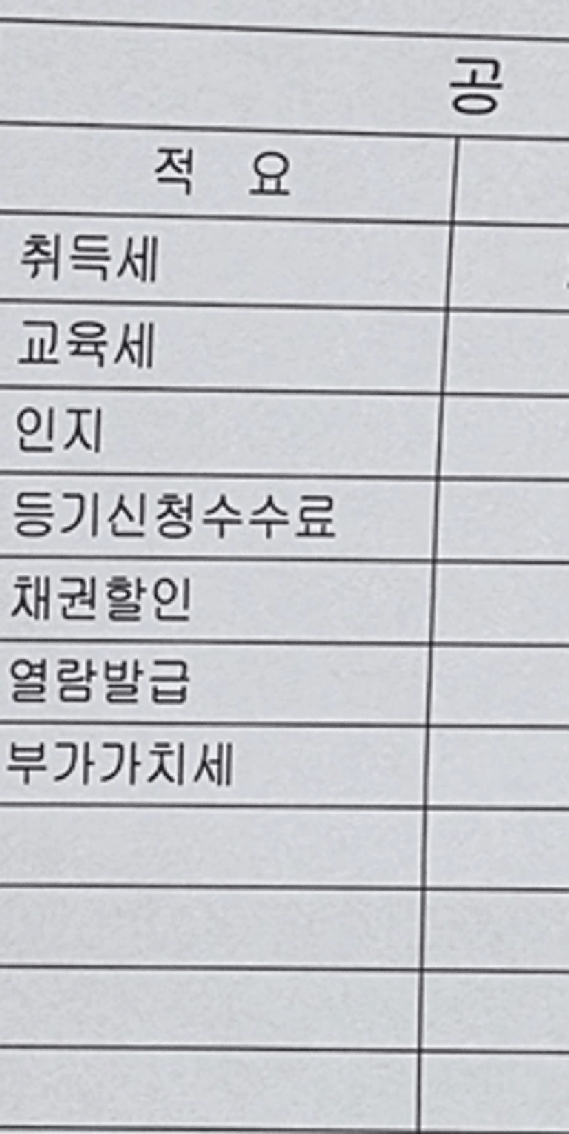 취득세, 교육세, 인지대, 등기신청수수료, 채권할인액은 필수 비용이니