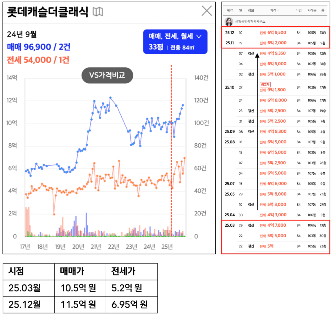 대장단지인 롯데캐슬더클래식에서 전세의 급격한 상승에 따른 매매가격의 급등을 보였습니다.