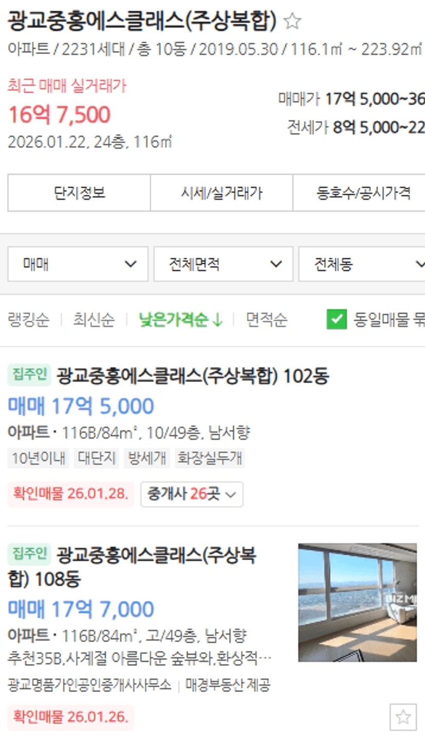 지난달 시세 트래킹을 하며 광교가 17억 원을 호가하는 것을 보고 글을 남긴 적이 있습니다. 당시 다른 상급지의 가치와 비교했을 때, "광교가 다소 비싸지 않나?"라는 의문을 제기했었습니다.