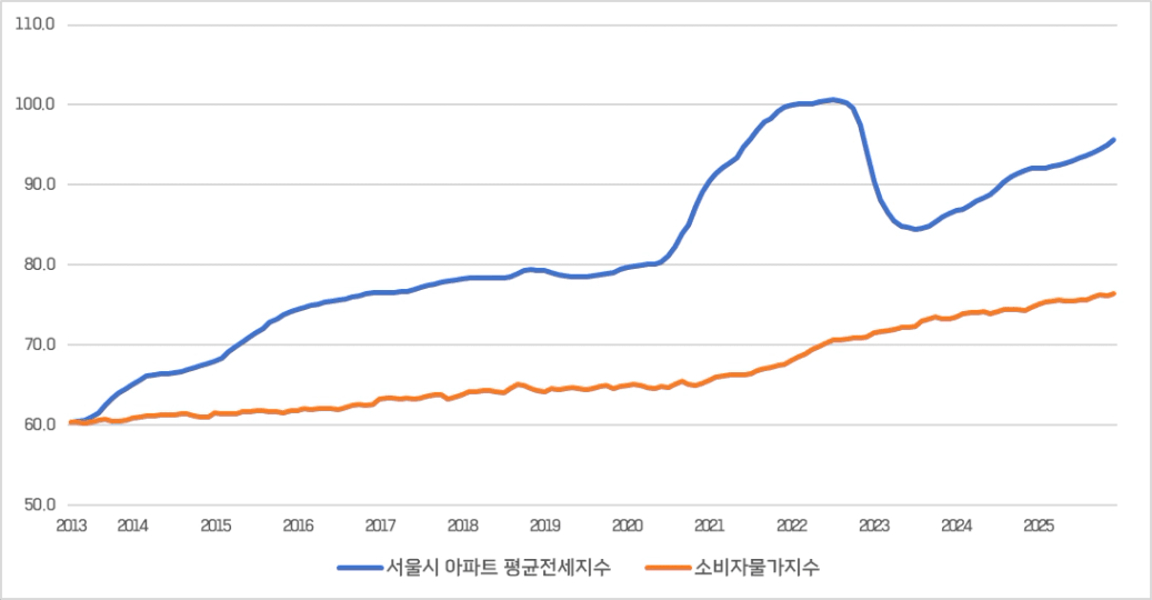서울 아파트 평균 전세가 산출이 시작된 2013년부터 현재까지 약 13년간을 살펴보면, 서울 아파트 전세가격지수는 약 1.58배 상승했고 같은 기간 소비자물가지수는 약 1.26배 상승했습니다.