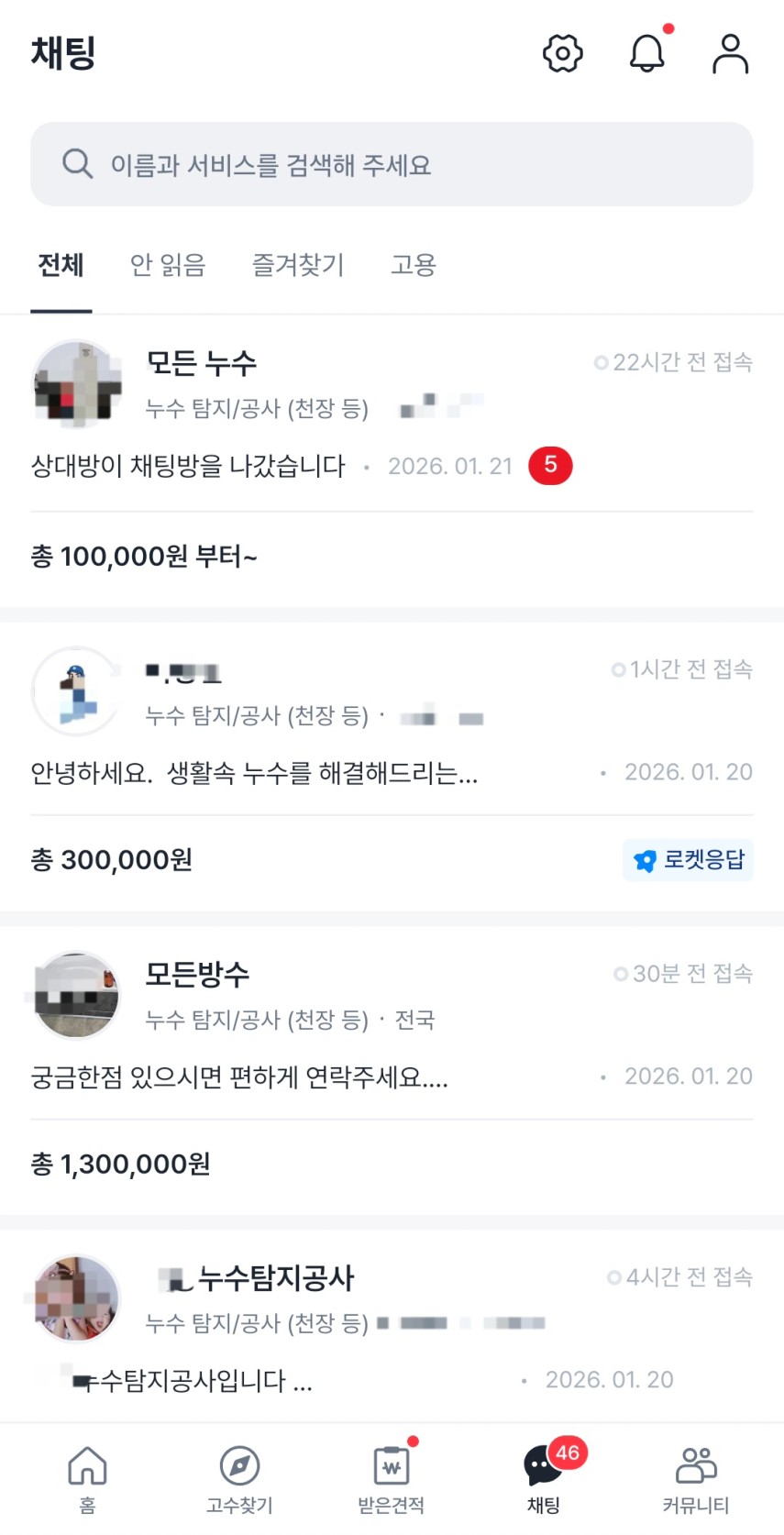 해당 사이트에 관리 사무소에서 파악한 대략적인 원인과 아랫집 혹은 세입자에게 받은 사진을 업로드하고 업체를 서칭해봅니다. 워낙 다양한 업체들이 있다보니 올린지 1시간도 채 안되어 20곳 이상에서 연락이 왔는데요.