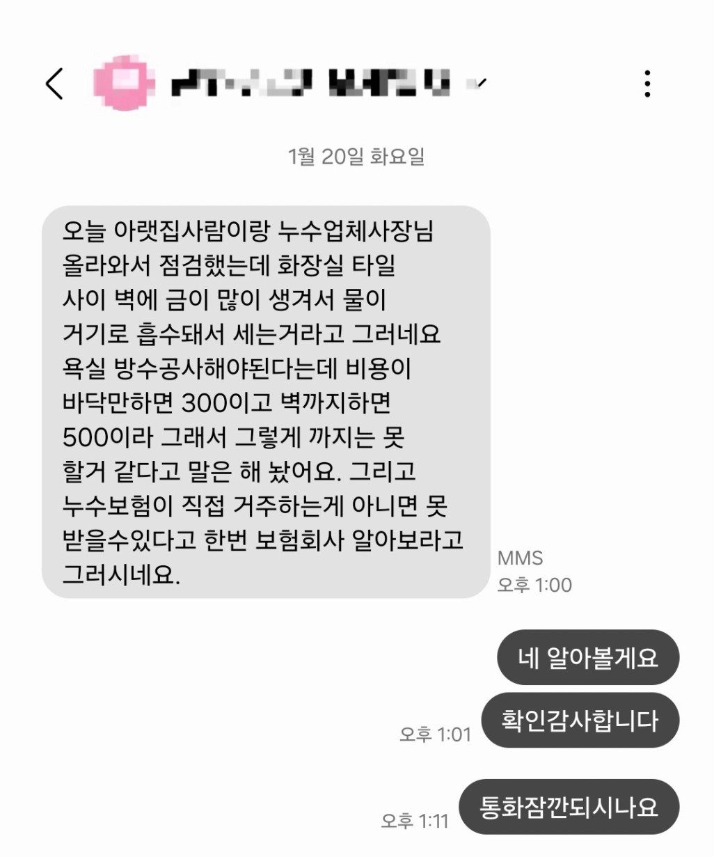 다음으로는 피해받은 집에 연락을 합니다. 만약 누수의 원인이 저희집이 맞다면 누수 탐지 일정 조율부터 피해 보상까지 아랫집과의 연락이 불가피하기 때문입니다.
