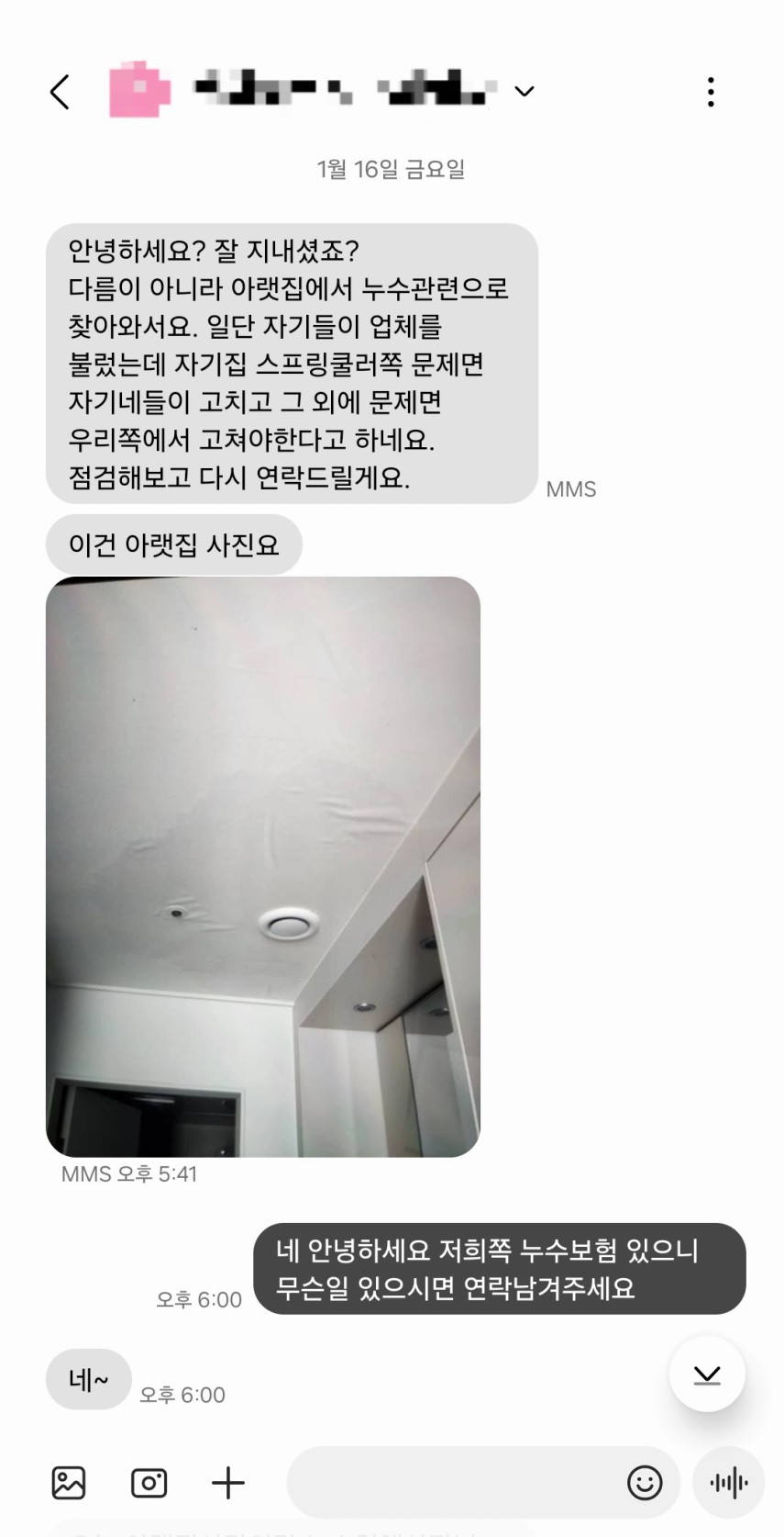 세입자: 안녕하세요? 잘지내셨죠? 다름이 아니라 아랫집에서 누수 관련으로 찾아와서요. 일단 자기들이 업체를 부ㄹ렀는데 자기집 스프링쿨러쪽 문제면 자기네들이 고치고 그 외에 문제면 우리쪽에서 고쳐야한다고 하네요. 점검해보고 다시 연락드릴게요. 이건 아랫집 사진요.