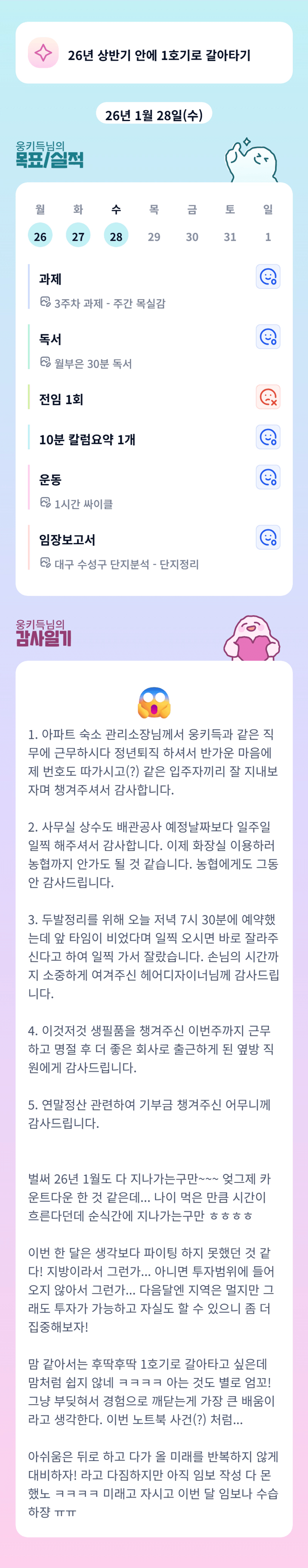 키득님 1월 한 달 대구까지 앞마당 넓히러 가신 것 아주 대단하셔용👍👍 운동이랑 임보 꾸준하게 잘 하고계시네용 저는 그게 너무 어렵습니다 ... 어제도 럭키키득님의 하루 고생하셨어요! 오늘도 화이팅