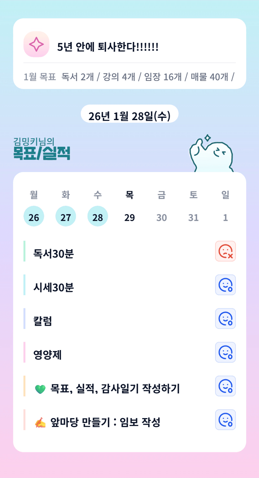 밍키님~~ 최임 제출하시느라 그리고 한 달 간 정말 고생 많으셨어요!♥ 시간이 정말 쏜살같이 가네요~~ 항상 우리 생존이들에게 긍정에너지 뿜어주시고 함께 즐기며 나아가는 분위기 만들어주셔서 감사해요♥ㅎㅎㅎ 다음 달도 조장님으로 멋진 한 달 만들어가시길 늘 응원할게요! 기분 좋은 하루 만들어가시고 이따 저녁에 뵈어유~~♥ ^^