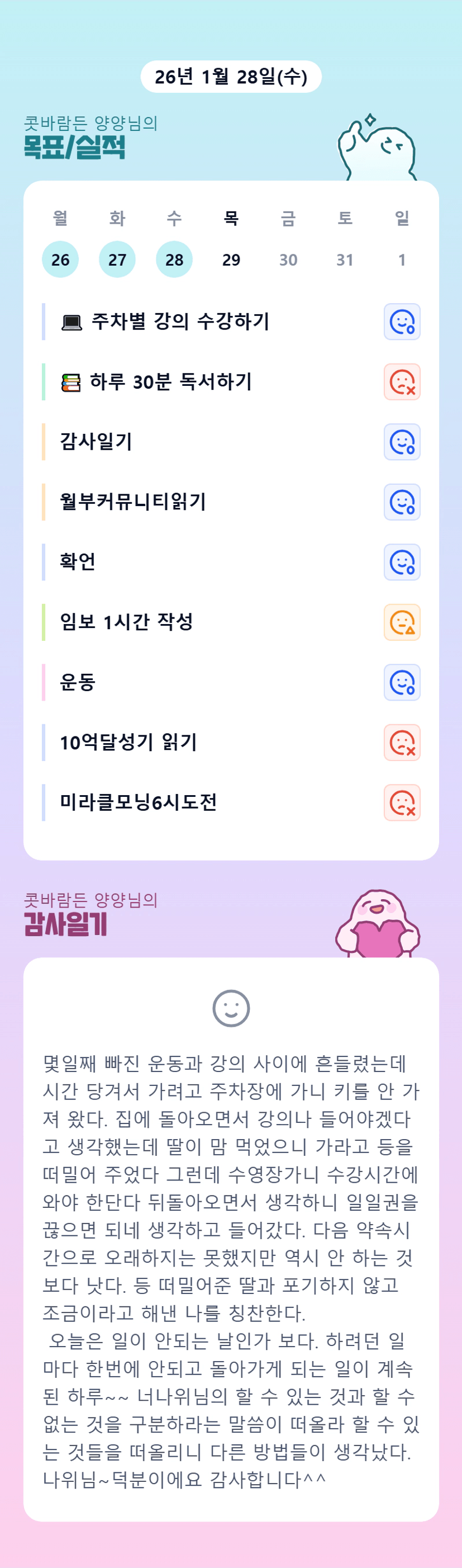 양양님~~ 운동 어떻게든 한게 중요한거같애요 ㅎㅎ 운동끊기면 다시하기 참 어려운데, 잘하셧어용! 마무리 잘해보아요ㅎㅎ