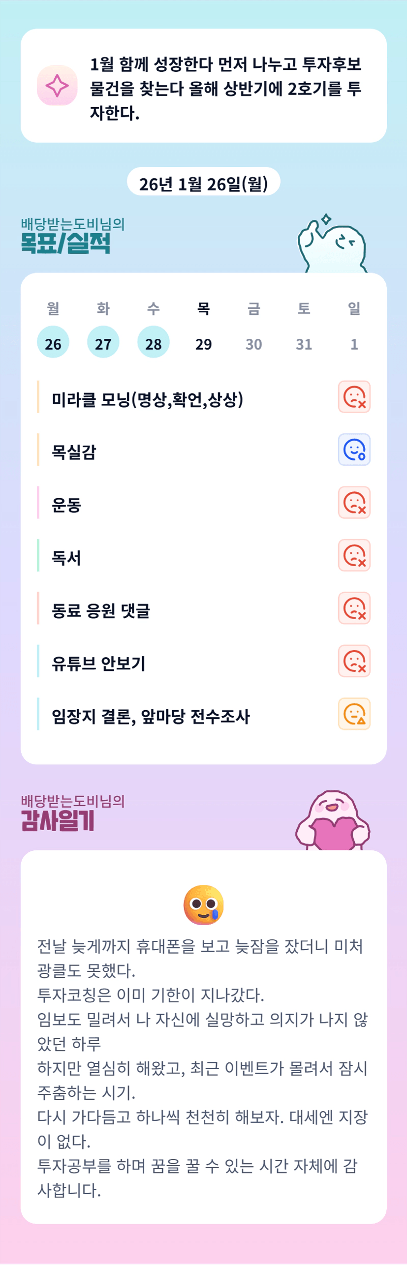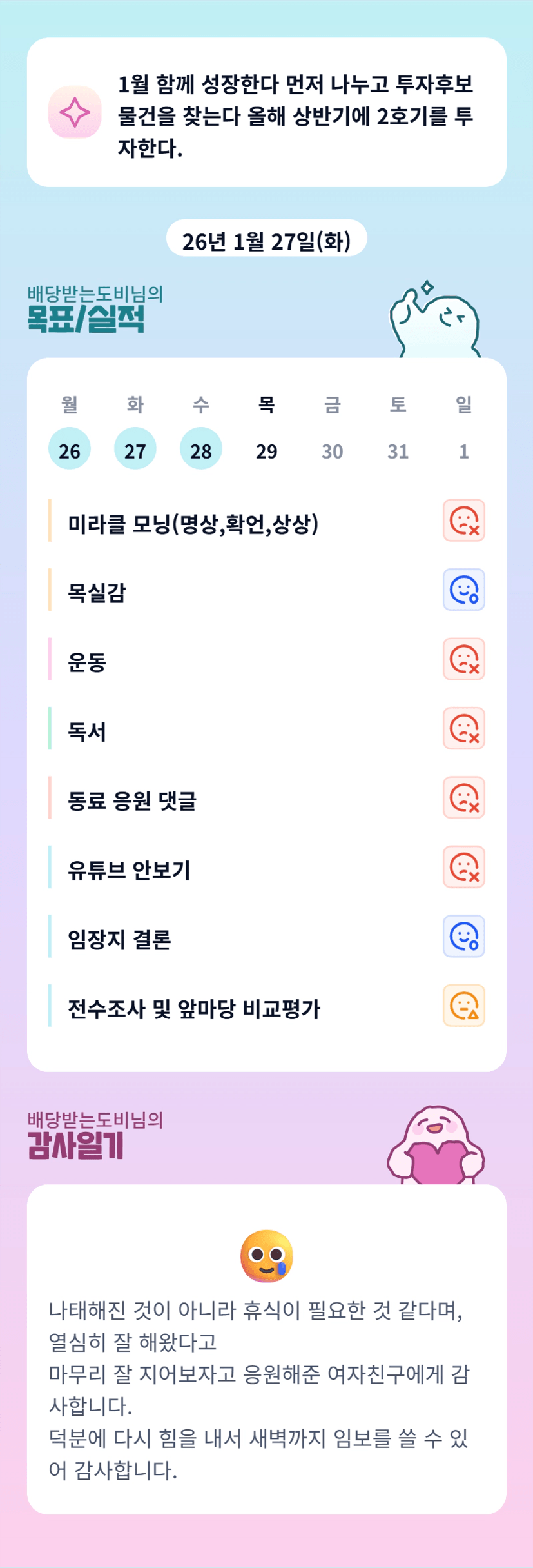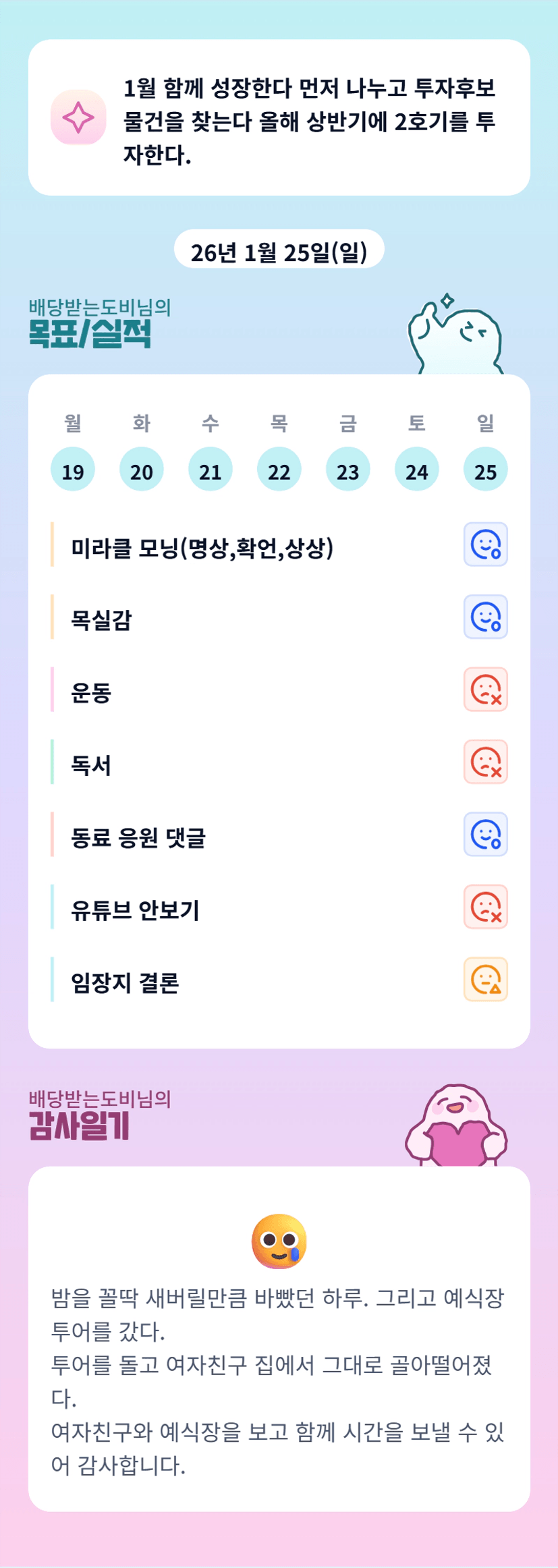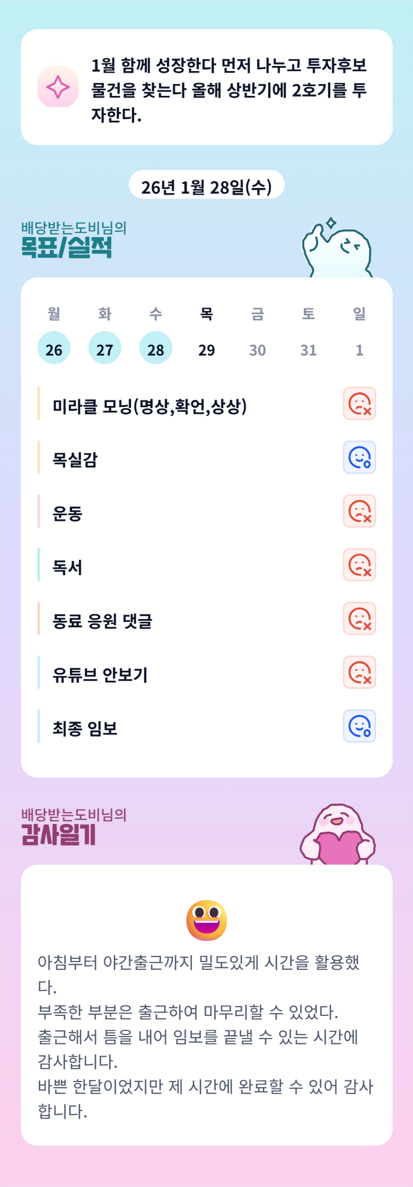 쉽지않은 일정으로 보낸 한달! 도비님 너무 수고 많으셨어요. 열심히 달려오셨기에 휴식도 필요하고, 또 그런부분을 이미 잘 알고 대처하고 계신 도비님 👍 마지막 최종모임만 남았네요 ^^ 마무리까지 같이 잘하고, 계속해서 앞으로 나가가시죠❤️