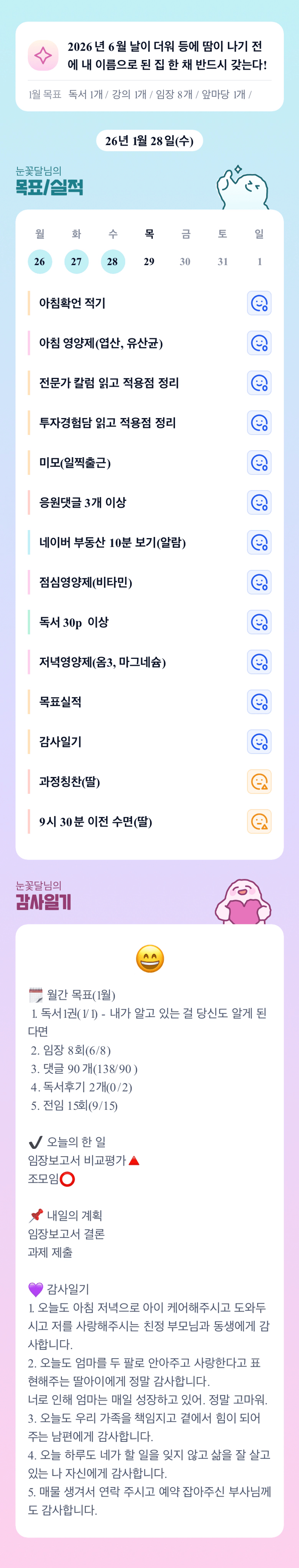 행복하고 따뜻한 목실감을 보니 저도 행복해져요 눈꽃달님:) 아이 과정칭찬을 리스트에 넣고 꾸준히 실천하고 계신 눈꽃달님! 정말 아름답고 멋지십니다!!>_<오늘도 따님과 행복한 하루 되세요!!