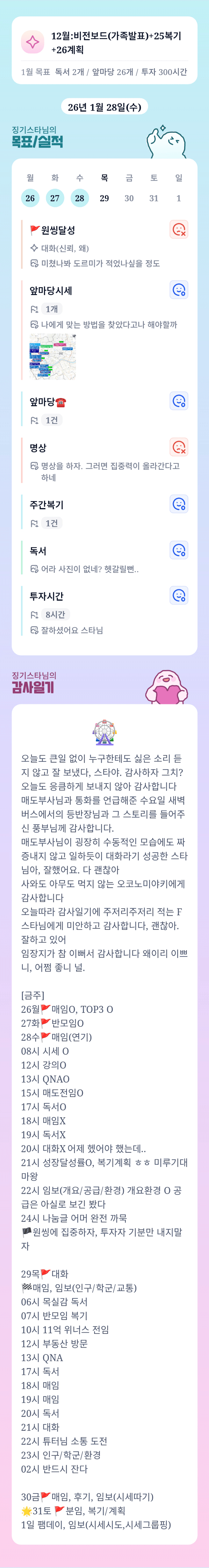 너무 잘 해내고 계신 스타님!! 앞으로 다 잘 풀릴 스타님~!! 항상 응원합니다앗 💛