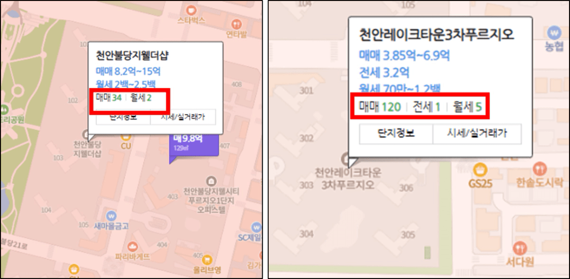 불당과 성성 지역의 경우 전세 매물이 거의 없어서