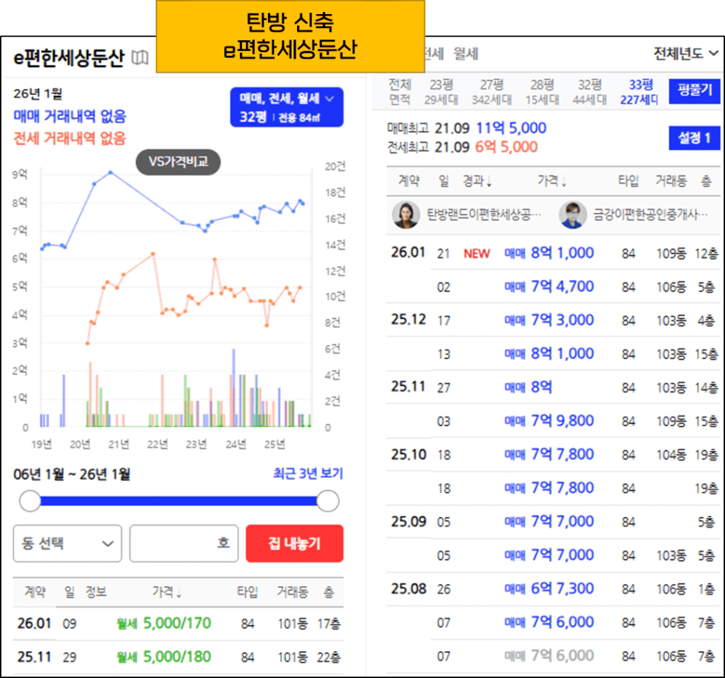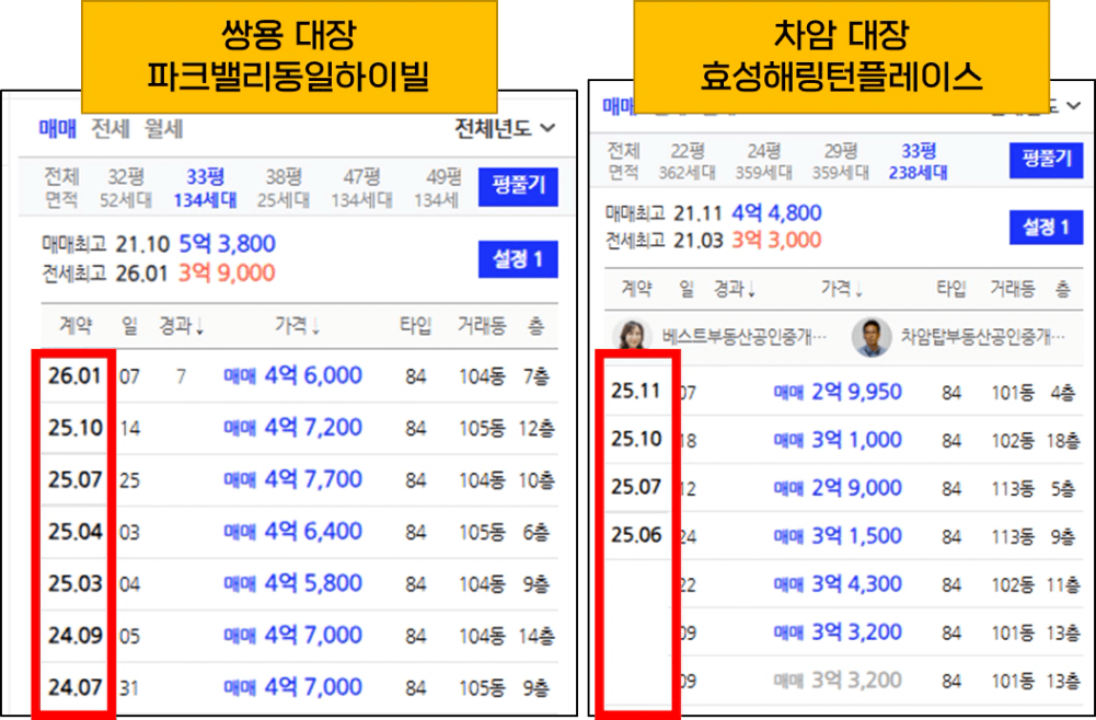 반면, 쌍용/차암 지역은 거래가 거의 이루어지지 않는