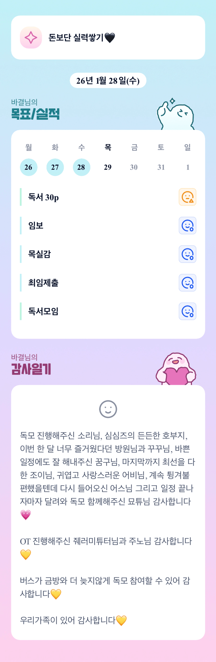 조장님~ 최임에 독모에 OT 까지! 우리 조장님의 한계는 어디까지인가!! 너무 고생 많으셨습니다~! 우리 이따 만나영🤗