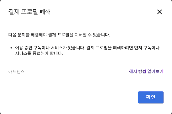 4. 제미나이한테 물어봐서 A계정 ‘결제프로필도 폐쇄’하라고 해서 하려고 하는데, 여긴 또 애드센스를 종료하라고 뜨네요….계속 돌고 돌고 있어요.ㅠㅠㅠ 도와주세요!