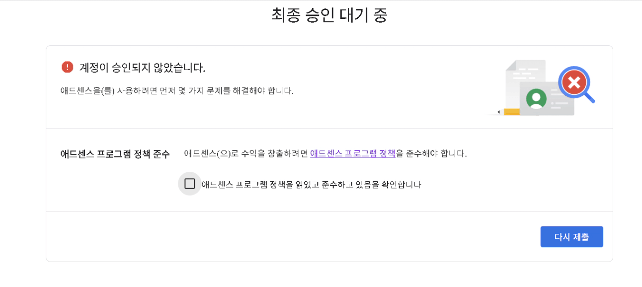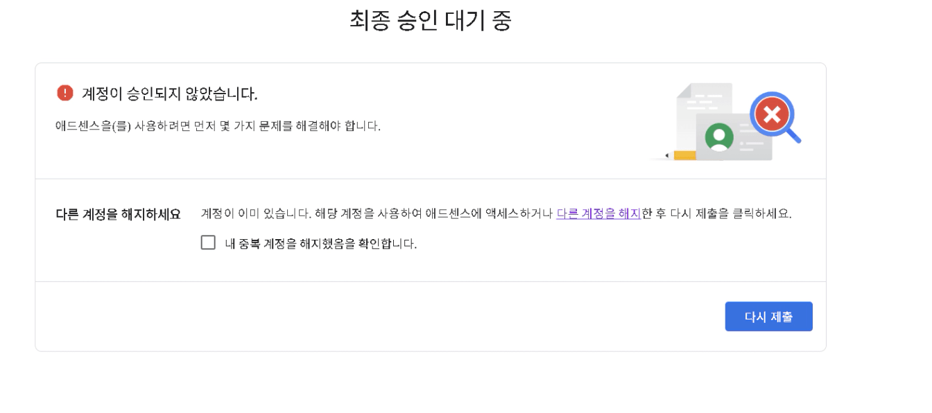 2. 그리고 B계정을 만들어서 다시 승인신청을 했는데 A계정 애드센스에 이게(1번 사진) 떠있어요.