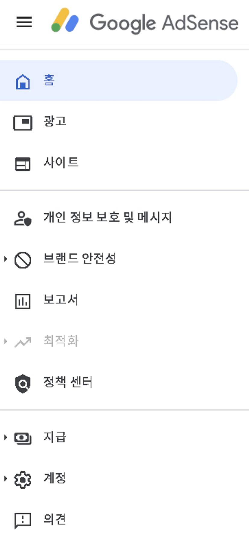 3. 혹시 몰라 C(남편계정), D(언니계정)도 만들어서 신청중인데 그 두 계정은 애드센스 창 왼쪽에 이런 메뉴도 뜨는데(3번 사진), A, B계정은 이런 것도 안뜨고 홈, 의견 버튼만 활성화 되어있어요.