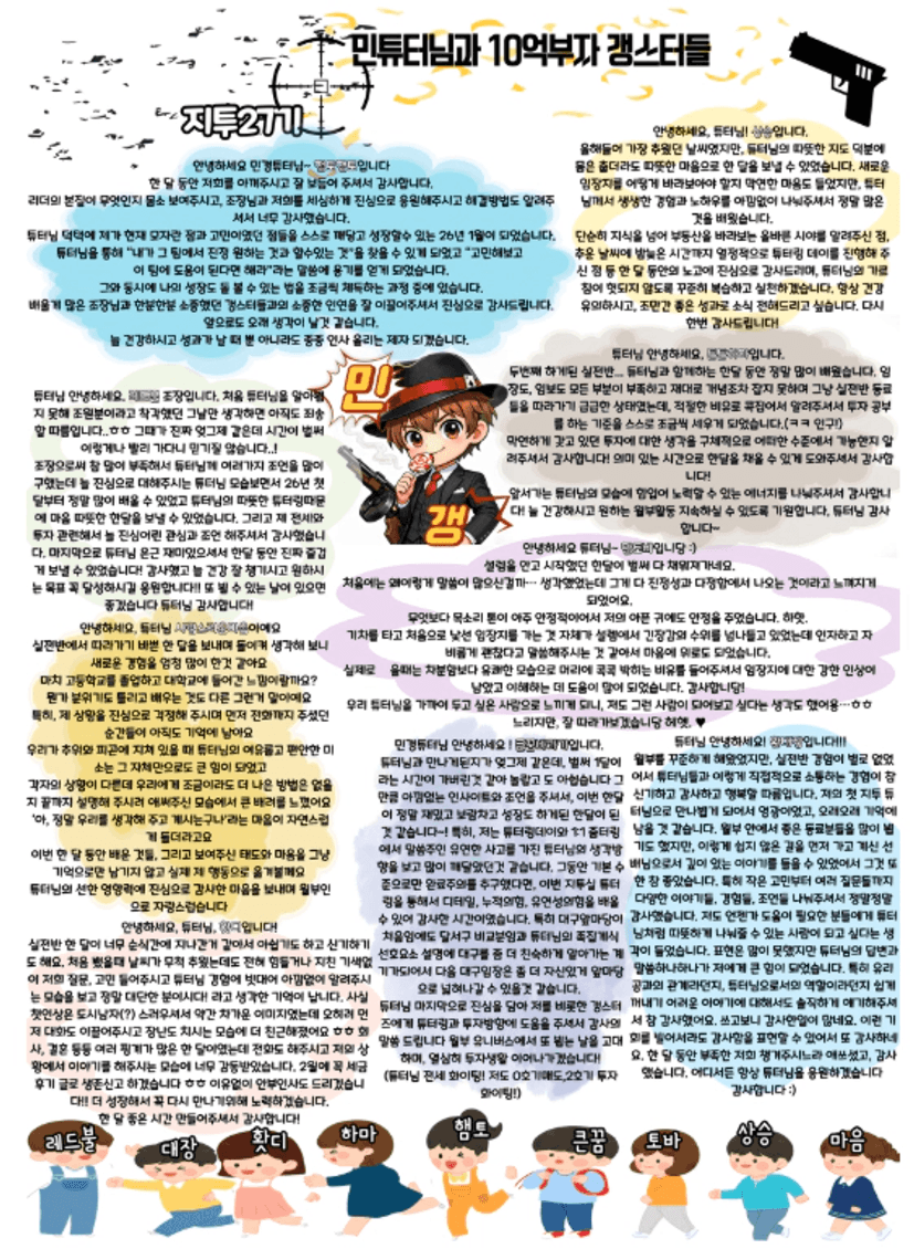 개인적으로는 마음을 열고 성장을 하게 해주신점과, 강사와의만남 가게끔 세심한 배려까지 너무 황송하고 감사했습니다. 0호기 매도와 투자자로서의 성장, 배운대로 꾸준히 해보겠습니다. 한명한명 챙겨주신점 보고 저도 조금씩 따라해보도록 노력하겠습니다
