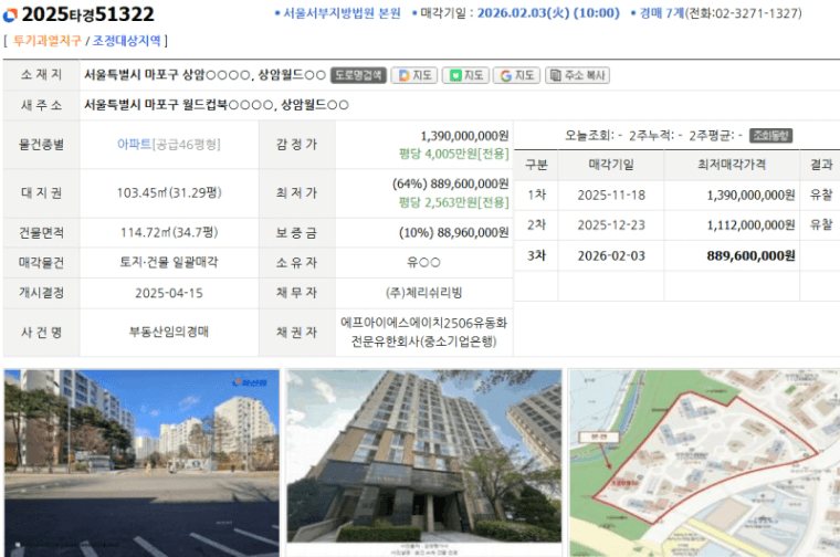 마포구 상암동에서 희소성 있는 대형 평형 매물이 감정가 대비 64% 수준까지 떨어졌습니다.