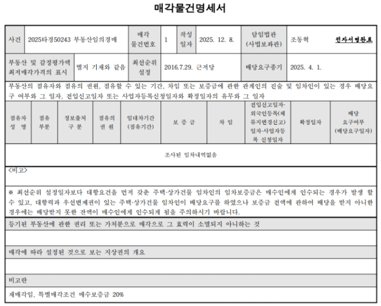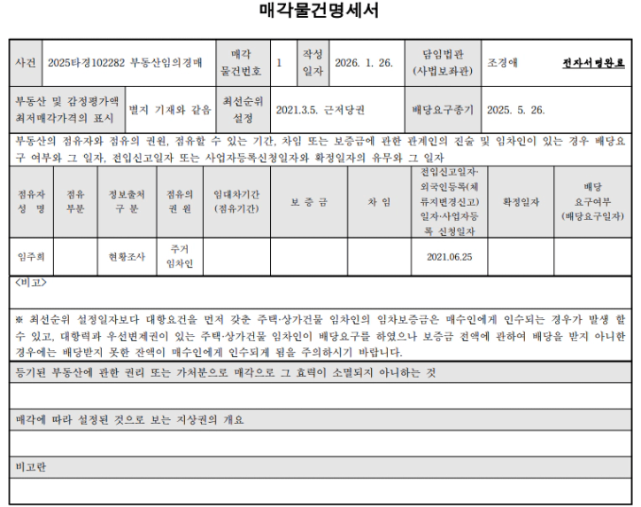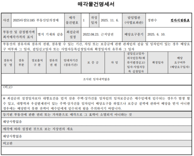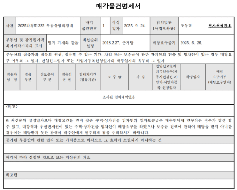 법원의 현황조사 및 전입세대 확인 결과 현재 소유자 세대가 전입되어 있으며 별도의 임차인은 존재하지 않습니다. 낙찰자가 추가로 인수해야 할 보증금이나 등기부상 하자는 없는 것으로 보입니다.