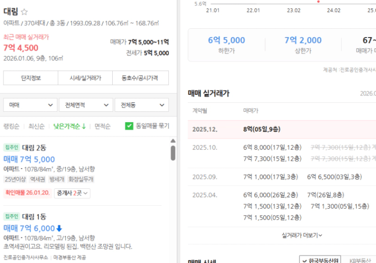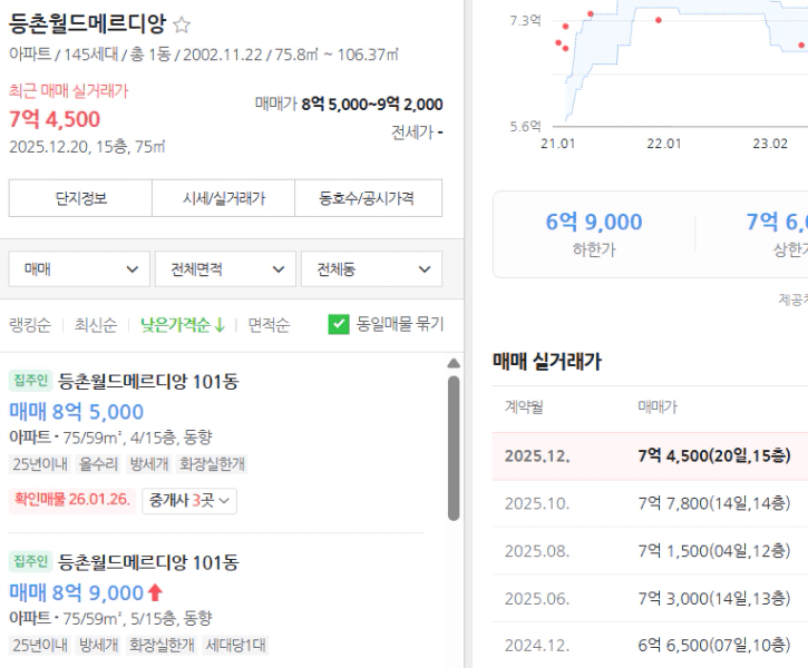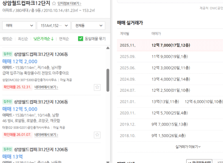 최근 실거래가를 보면 2025년 10월 14층 매물이 7억 7,800만 원에 거래되었으며, 8월에는 12층이 7억 1,500만 원에 매매되었습니다. 12월은 7.45억이네요~