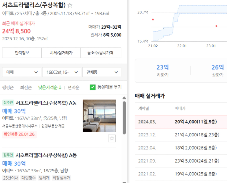 실거래 자료에 따르면 동일 평형(133㎡)이 2024년 3월 5층 20억 4,000만 원에 거래된 바 있습니다.