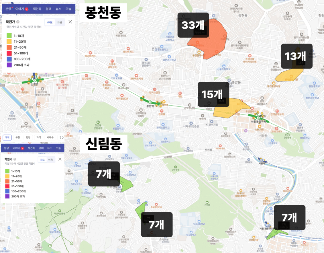 학원이 100개 이상씩 밀집돼 있는 반면,