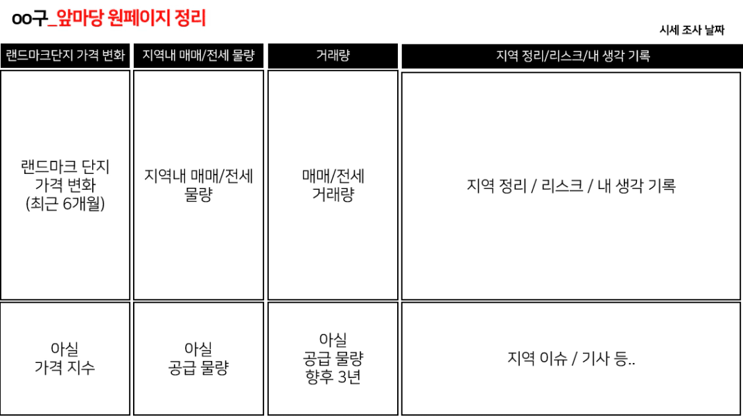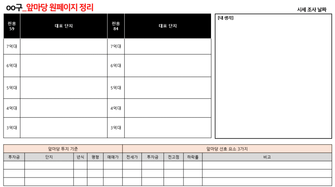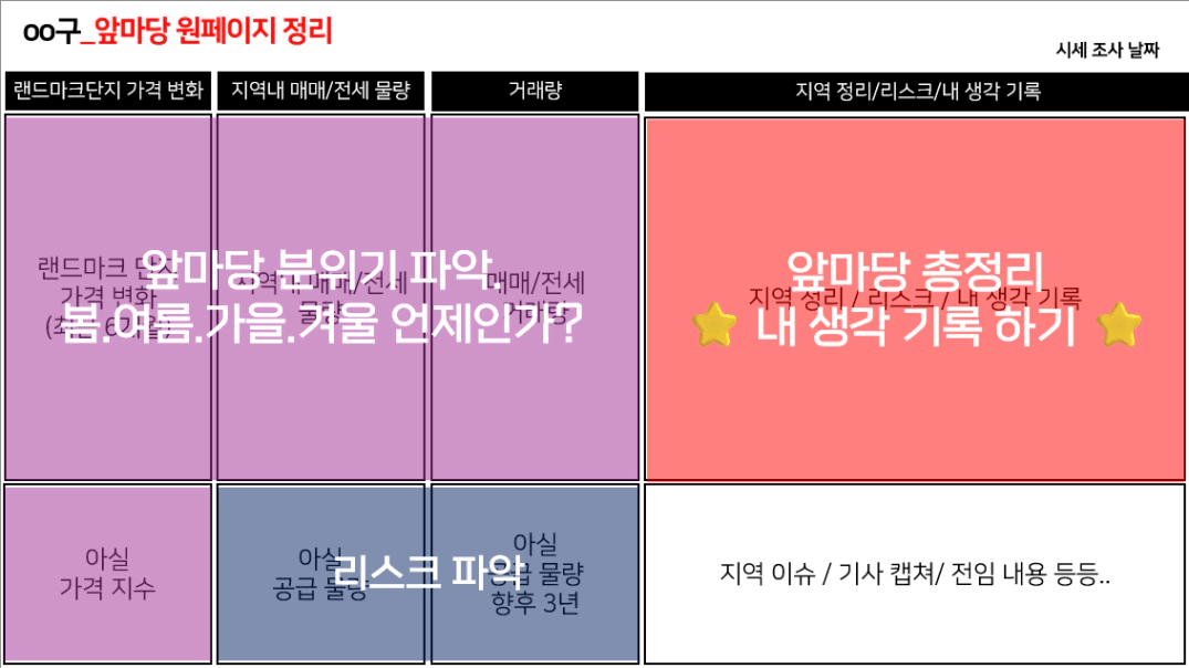 그럴 때 앞마당 시세 흐름, 이슈, 공급 상황, 투자 기준들을 한판에 정리하고 투자의 안목을 다질 수 있는 효율적인 방법이 바로 앞마당 원페이지 입니다!