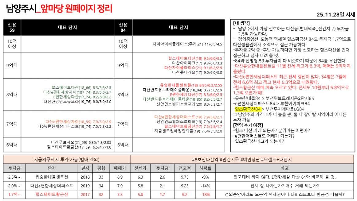 ✅3번은 투자금이 있다면 앞마당 안에서 우선순위로 두고 싶은 단지 3개를 기록하고 기회가 왔을 때 빠르게 행동하기 위한 장표 입니다. 아래에 예시 장표를 남겨 두었습니다 :)