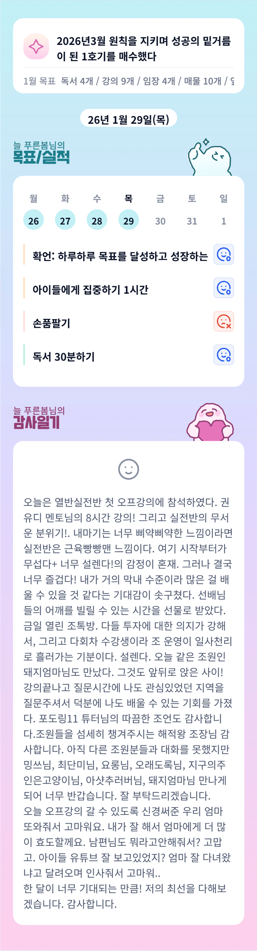 봄님 오늘 얼굴뵈어서 너무 좋았어요~~ 이번달 봄님과 함께할 한달 기대됩니다~~ 홧팅입니다~!!!!!