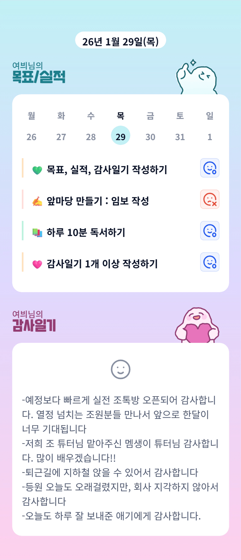 헤헷 생각보다 많이 빨랐죠?? 저도 조원분들 입장에 대한 예고가 없어서 많이 당황했었어용😆 한 달 동안 잘 부탁드릴게요❤