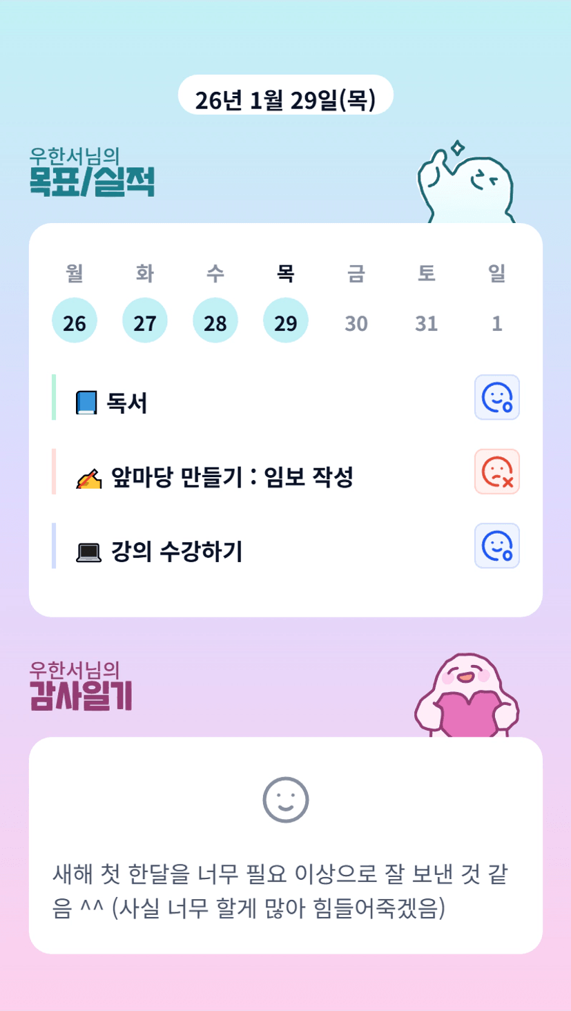 새해 시작이 순조롭게 진행되는걸보니 26년에는 좋은일만 생기려나 봅니다😄 욕심쟁이 조장님 지치지않게 건강 잘 살펴요~ 앞으로도 화이팅!!