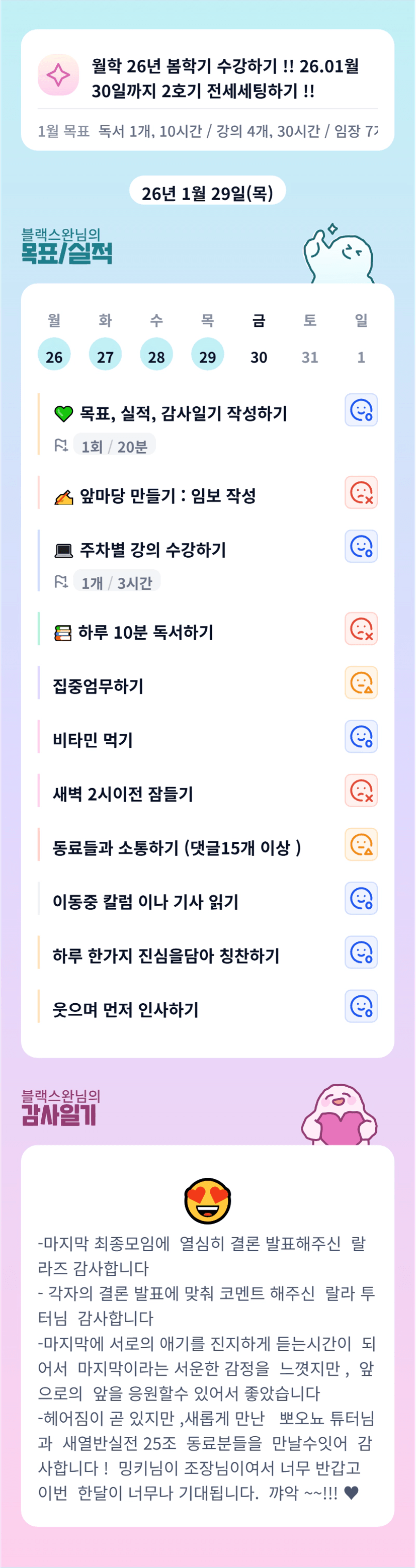 스완님 1월도 고생많으셨고 2월도 같이 뽜이팅해봐요🤍🤍🤍 덕분에 행복하고 치열한 한달이 될거같아요🤍 미리 감사드리고 잘부탁드립니닷🤍