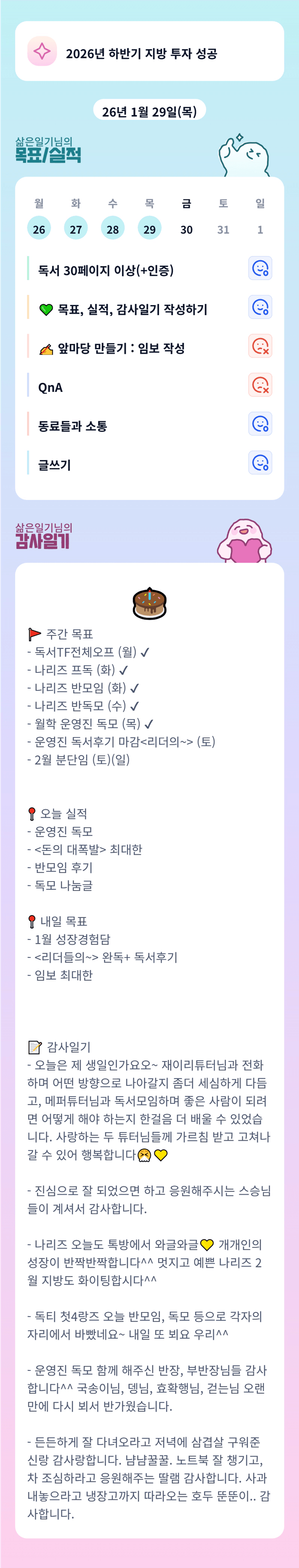+ 아차차!! 바쁜 와중에 통화하며 응원 담뿍 담아준 우리 멤반장님 ㅠㅠ 진짜 감사해서 쟈철에서 울뻔했습니다. 의지되는 사람은 어떤 사람인지 곁에서 배울 수 있어 감사합니다.