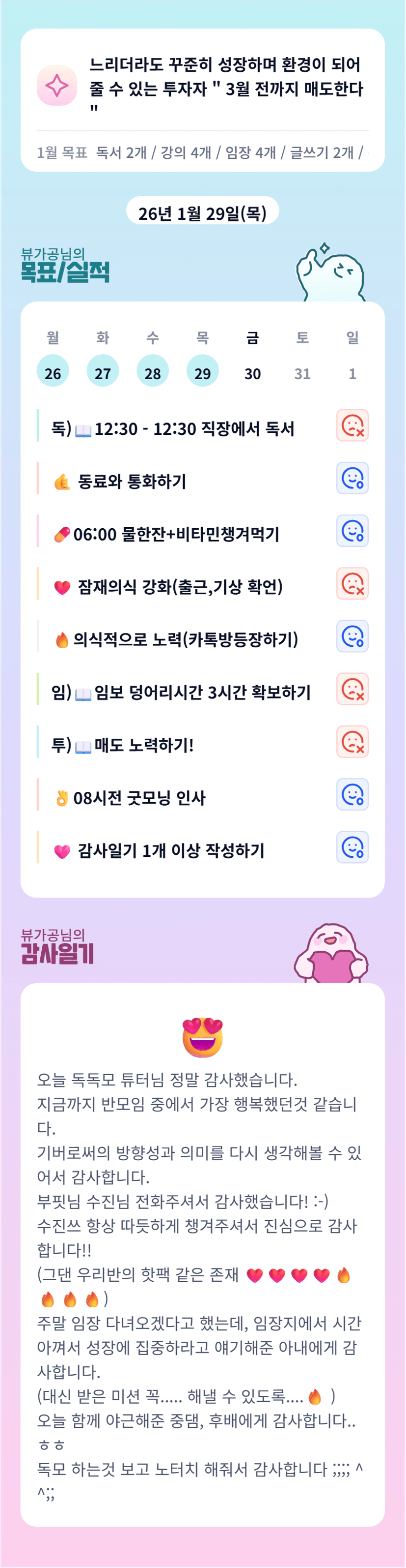 뷰님~~ 갑작스레 퇴근을 못하는 상황에서도 독모 참여해주셔서 넘 감사했습니다!! 어떻게든 시간을 내고 얼굴 비춰주심에 감사할따름입니다🙏😌 오늘도 같이 화이팅해봐요옹🔥🔥🔥🔥