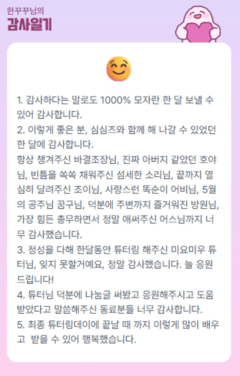 꾸꾸님 성장해나가시는 모습 보면서 한달동안 정말 행복했습니다 감사했습니다 :)