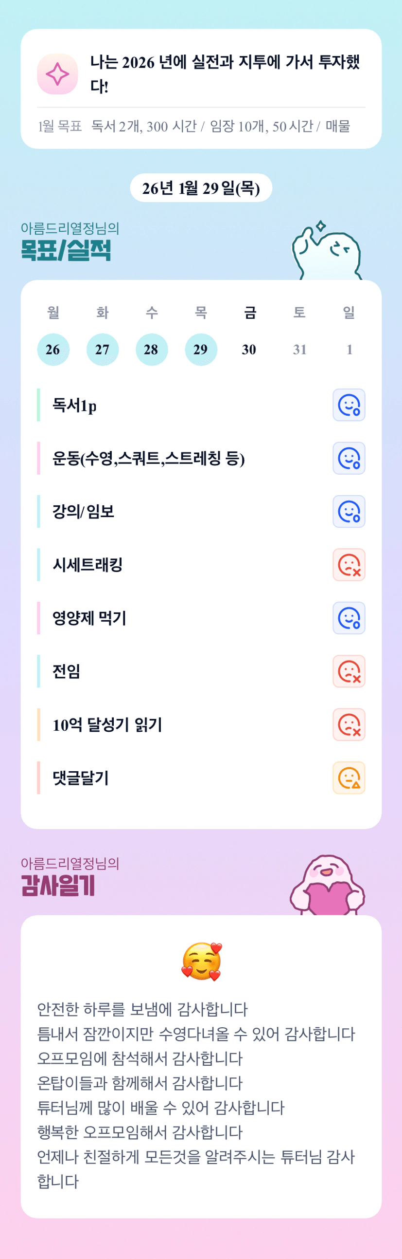 오오 아름님 어제 수영 다녀오셨군요☺️한 달 동안 넘넘 고생 많으셨습니다!!아름님 질문들 덕분에 제가 얼마나 많이 배웠는지 몰라요ㅠㅠ깊이있는 질문들 마구마구 해주셔서 넘 감사했습니다💛그리고 한 달 동안 잘 챙겨주셔서 감사했습니다ㅠㅠ목실감 보러 자주 놀러올게요! 아름님 2월도 빠이팅!!