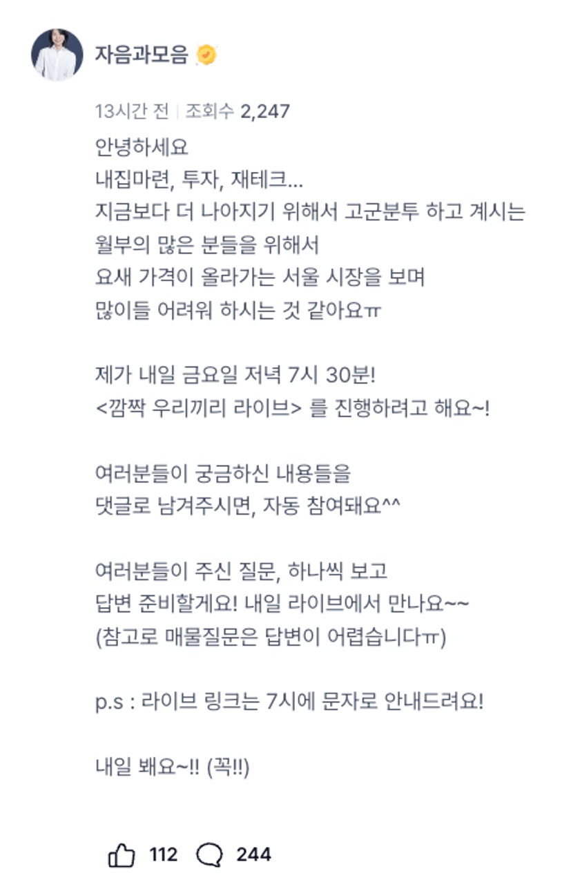 🚨 실시간 참여로 자음과모음님의 서울 내집마련 투자 전략을 배워가세요!