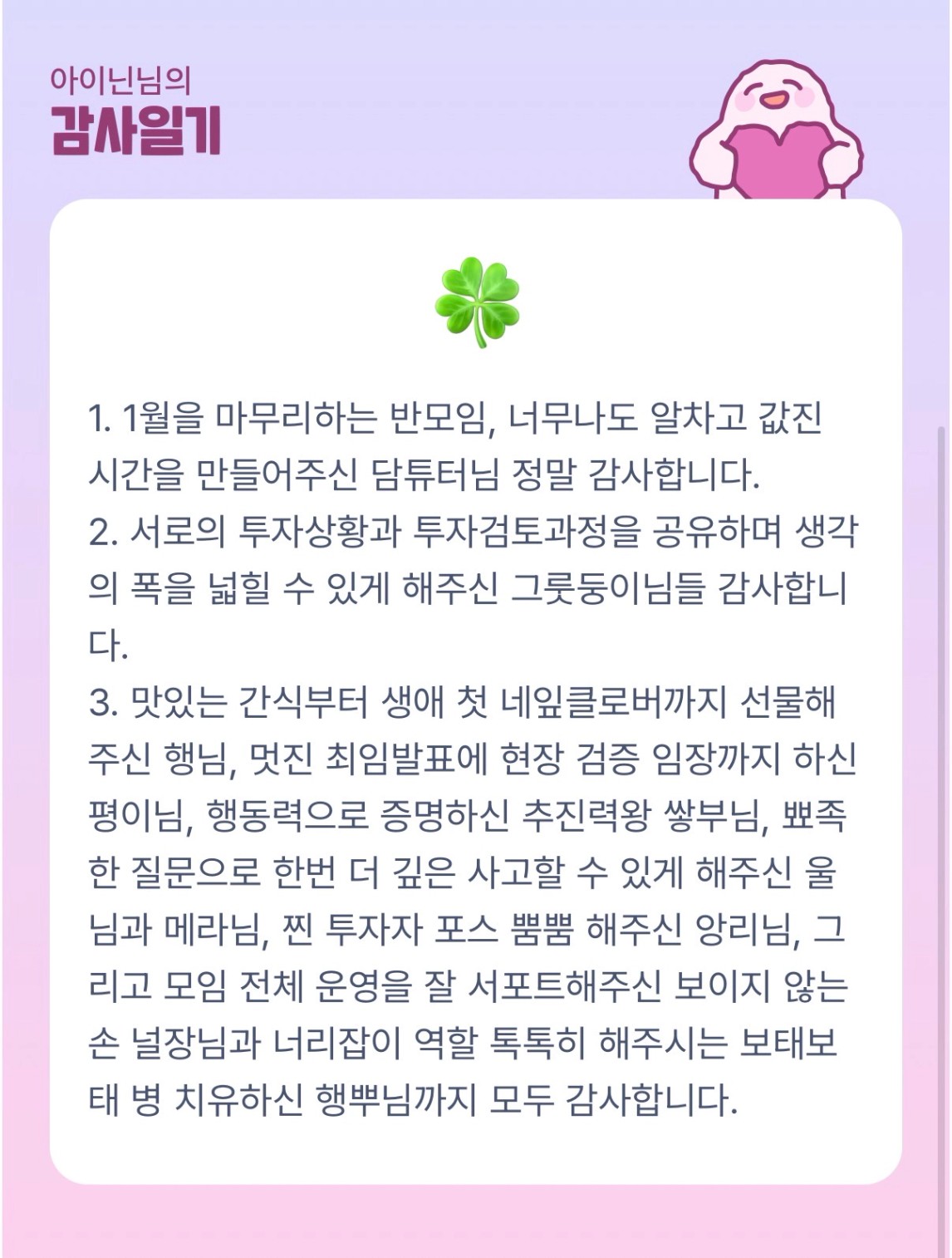 반원들 모두에게 보이지 않게 뒤에서 피드백 날려주신 우리 멋진 닌 슨배님 감사해요😊 함께 해서 너무 좋아요😁