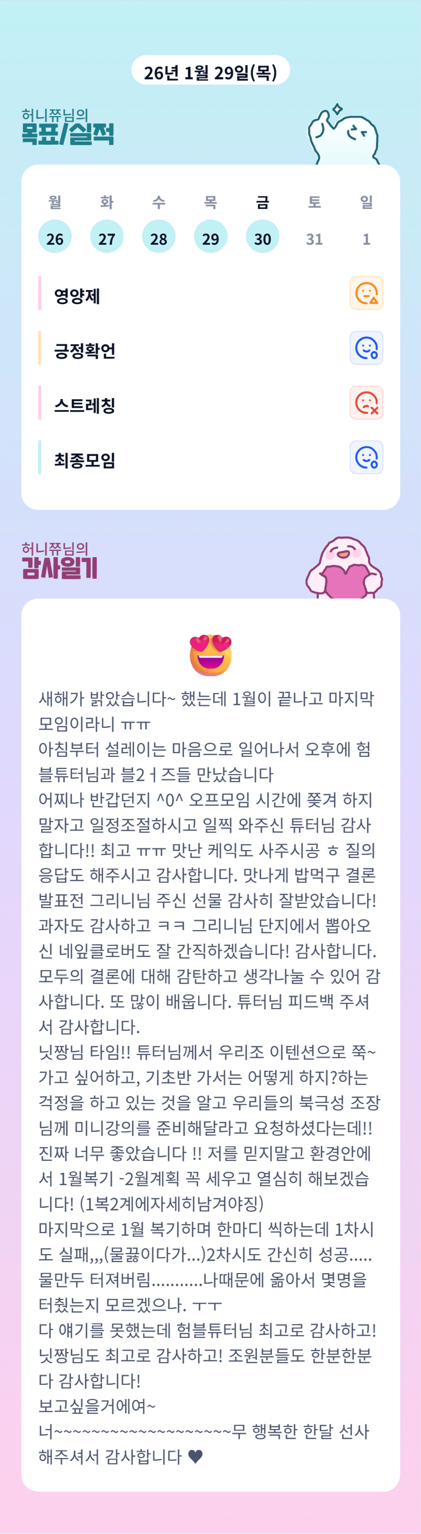 쮸님 정말 고생많으셨어요 담에 꼭 뵐 수 있기를요~~한달동안 같은조여서 정말 행복했습니다