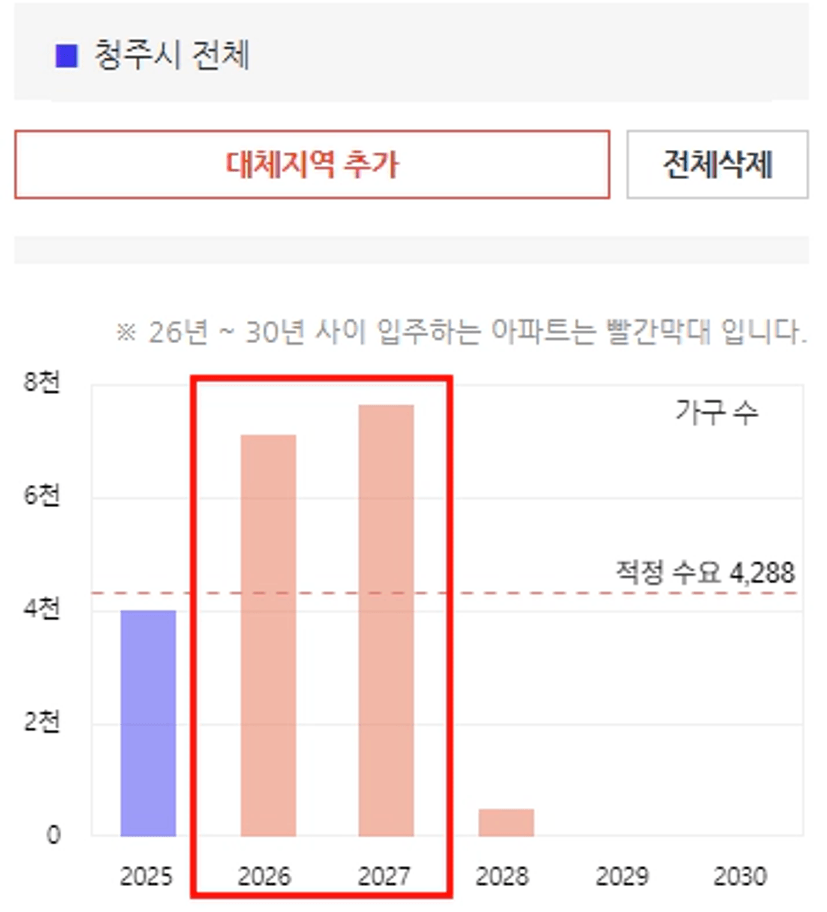 하지만 아시는 것처럼 현재 청주의 2026년, 2027년의 공급으 적정 공급 이상으로 큰 공급이 예정된 시장입니다.